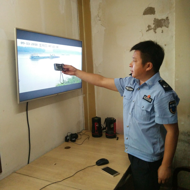 監(jiān)察大隊在取水泵站查看監(jiān)控視頻