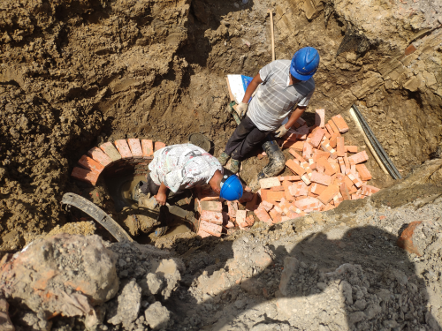 隨后我們來到了第二處:澴川路公安局前,由于市政工程導致此處水源口需要置換,前幾日將管道接好后,今天我們搶修工正在給該處總表閘閥修砌閘表井。
