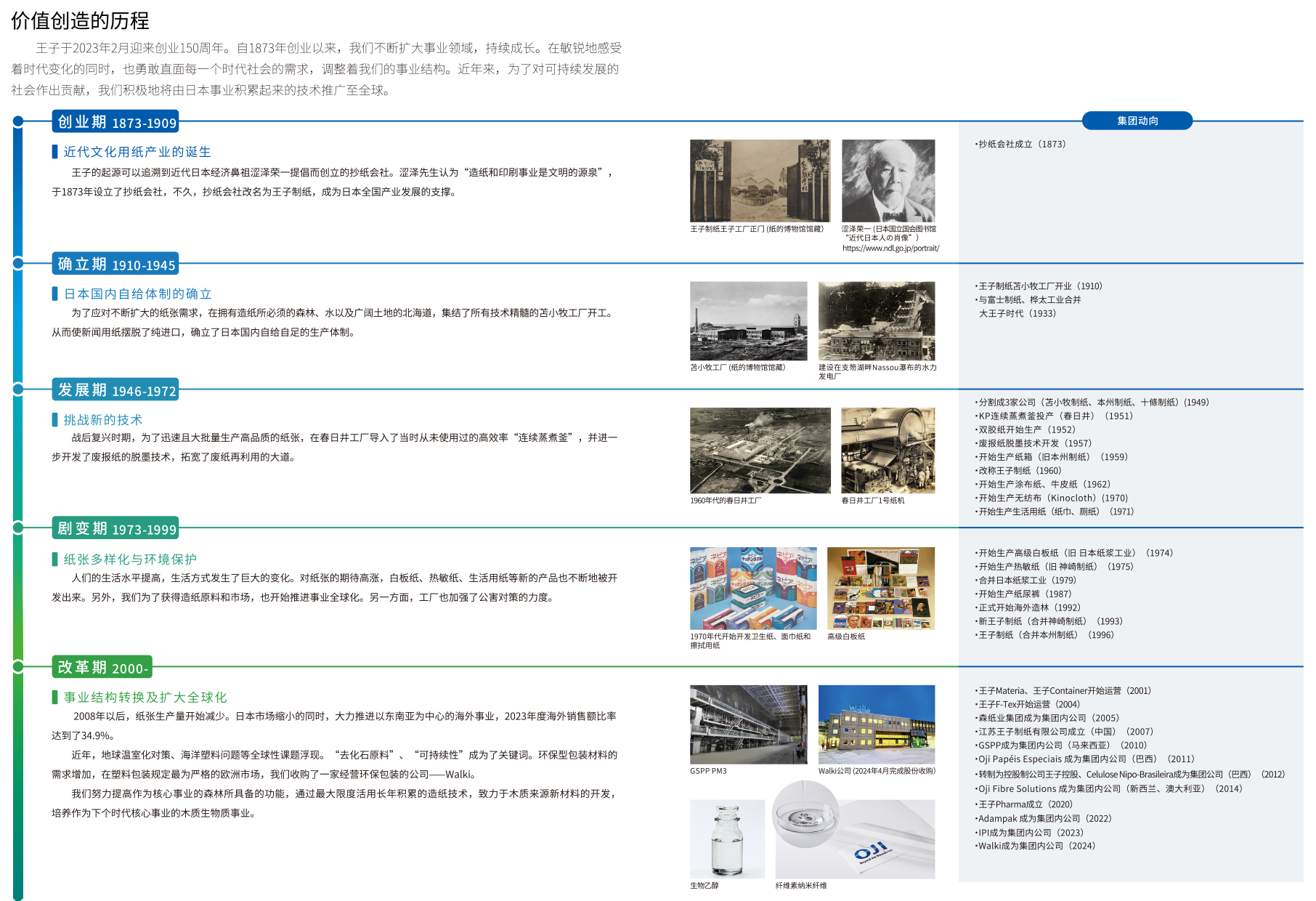自1873年創(chuàng)業(yè)以來,王子(OJI)不斷擴大事業(yè)領(lǐng)域,逐漸成長起來。我們時刻響應(yīng)著時代的變化,根據(jù)不同時代社會的需求,不斷改革自身的事業(yè)結(jié)構(gòu)。近年,我們將長年在日本國內(nèi)事業(yè)培養(yǎng)起來的經(jīng)驗技術(shù)向全球推廣,為構(gòu)建可持續(xù)發(fā)展的社會貢獻(xiàn)力量。